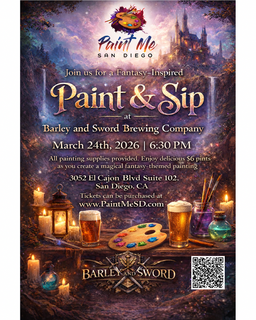 Step into a world of magic, creativity, and craft brews at our Fantasy Inspired Paint & Sip. Join us on Tuesday, March 24th, 2026 at 6:30PM for an enchanting evening of art and atmosphere at Barley & Sword Brewing Company.